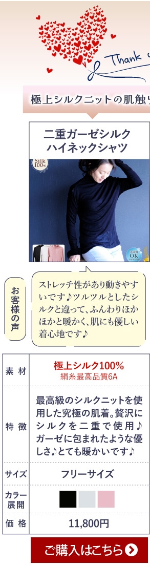 シルクLoverの方々に、得したなぁ、良い商品だなぁ、と思って頂けるように お買い求めやすく販売をしております。 「シルクの素晴らしさを広めて、より多くの方にシルクの良さを知ってもらいたい♪」 肌着やパジャマはシルクが当たり前になり、肌トラブルが減り、快適に過ごせるように 応援していきたいと願っております。 | |