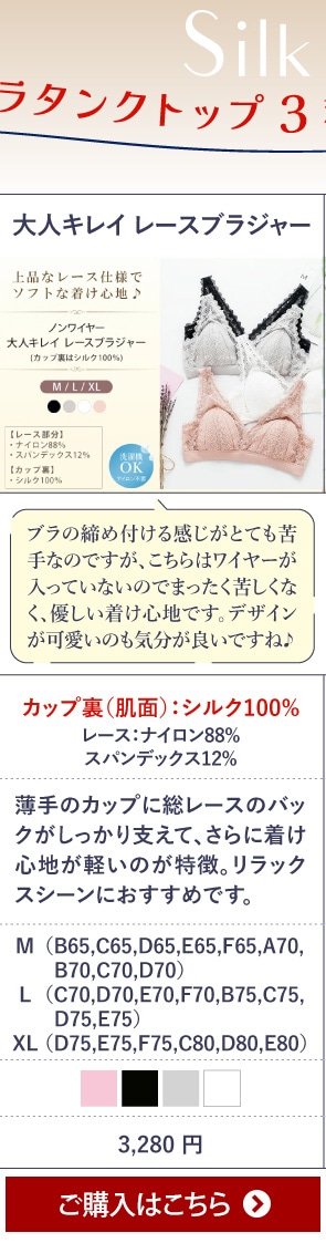 カップは取り外し可能で、カップ裏の素材はシルクを100%使用しているため、肌が弱い方にもおすすめです。