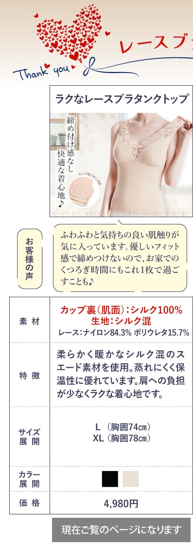 また、胸元から肩に沿ったレースがノースリーブタイプになっており、ずれにくく、肩への負担が少なくラクな着心地です。優しいフィット感で締めつけないのでお家でのくつろぎ時間にも最適♪