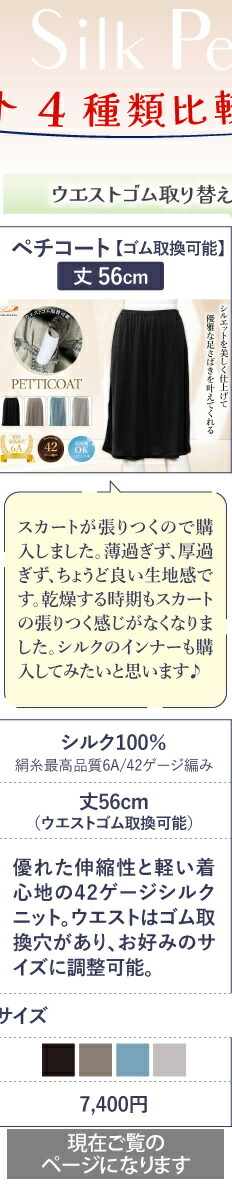 | 商品説明 | 究極の肌着「エレガントペチコート」。リピーターさん続出、大好評を頂いております♪日本では唯一、ルルルシルクだけの42ゲージシルクニット素材のエレガントペチコートです。なめらかな極上の着心地のシルク100%のペチコートの着丈は汎用性の高い長さの56cmです。こちらはウエストゴムの交換ができるので、サイズ調整して頂けます。最高級6A糸で編んだ希少価値の42ゲージ極上シルクニット。丈夫で美しいツヤ感。汗対策や下半身の冷えが気になる方におすすめです。吸放湿性に優れ汗もすぐ乾き、冬には保温効果も発揮するシルク、冷えを防いでくれます。お洋服を大切にされる方に最適です。 |